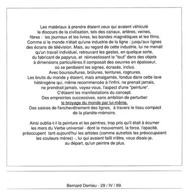 Ses matériaux : les journaux et les livres, les bandes magnétiques et les films, jusqu'aux lignes des écrans de TV. Tous les matériaux qui ont véhiculé le discours de la civilisation.